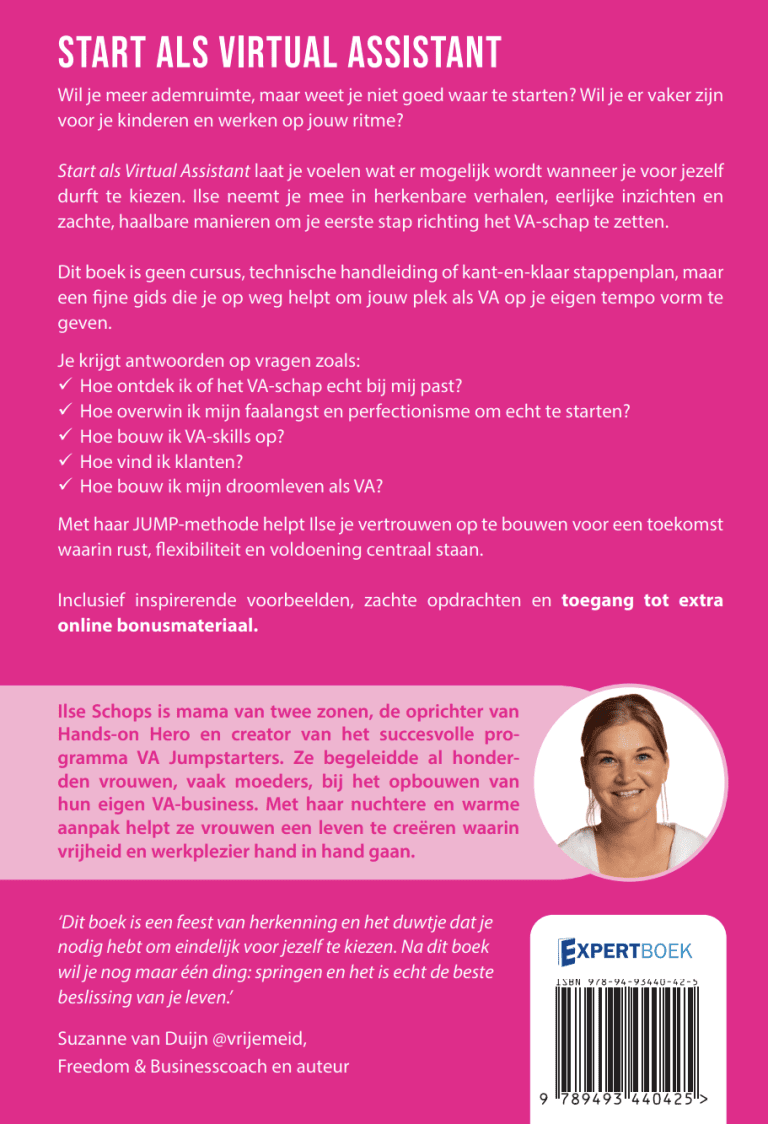 ‘Dit mindsetboek leest ongelooflijk vlot. Ilse slaagt erin om het VA-schap voor te stellen als een levenskeuze, één die je uitdaagt om anders te gaan denken en eindelijk voor jezelf te kiezen. De verhalen zijn herkenbaar, de voorbeelden zijn realistisch en Ilse schrijft met een warmte en eerlijkheid die meteen vertrouwen geeft. Je voelt dat ze dit pad zelf heeft bewandeld en dat ze begrijpt hoe het is om werk en gezin te willen combineren zonder jezelf te verliezen.’