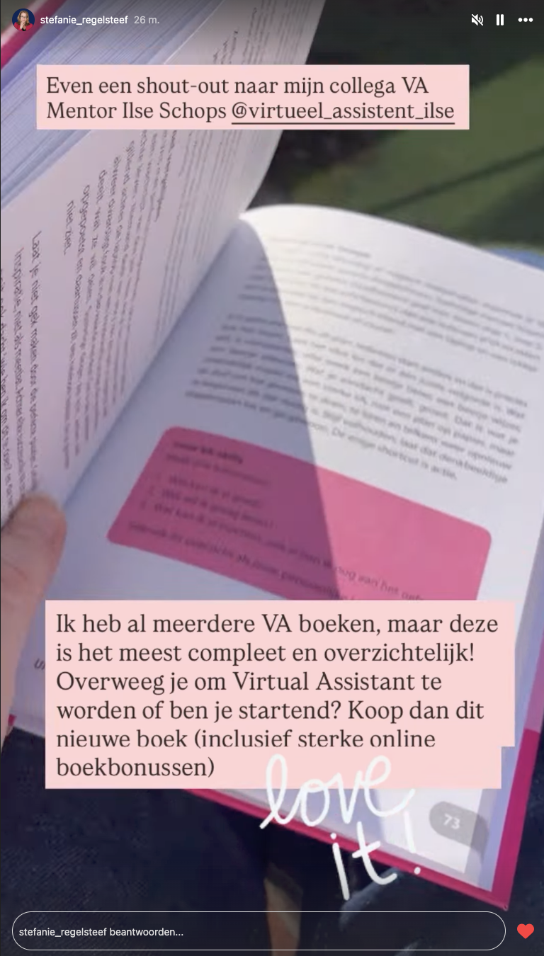 ‘Ik zit veel op social media en wist tot op heden nog niet 100% wat een VA precies deed. Ik dacht altijd dat het aanleunde bij influencer zijn, wat ik zelf doe. Tot ik dit boek las. Nu weet ik wat het allemaal inhoudt en hoe belangrijk een goede VA is.’
